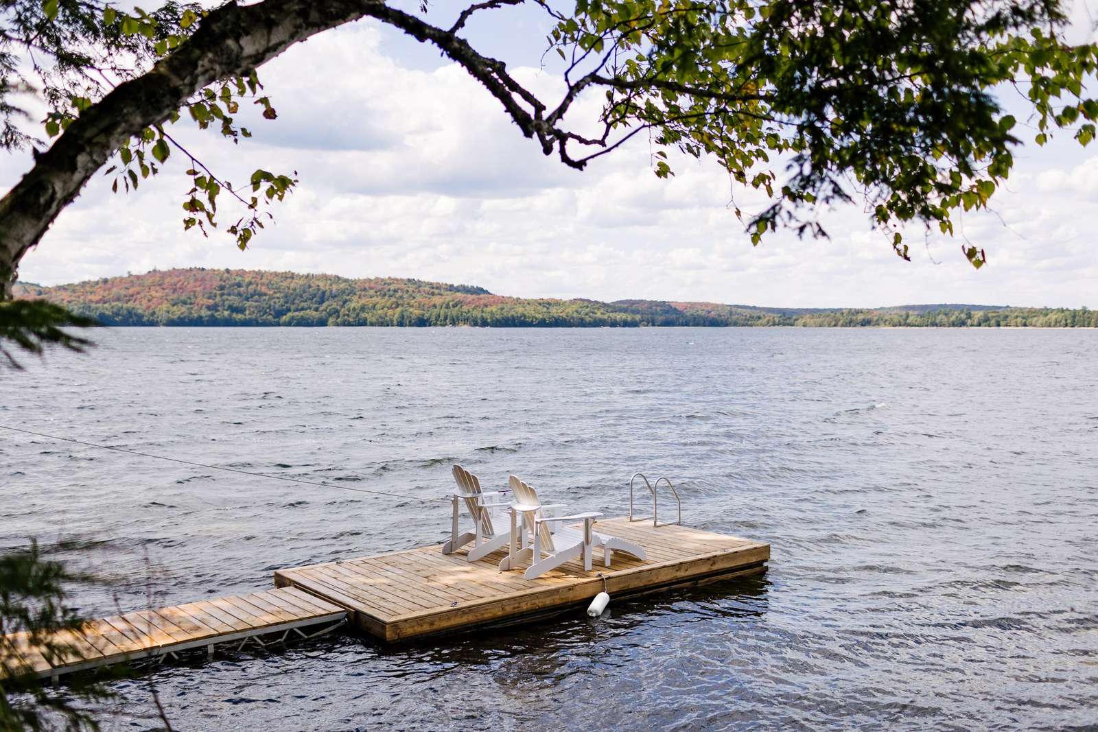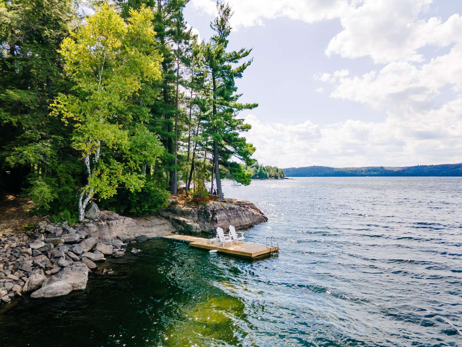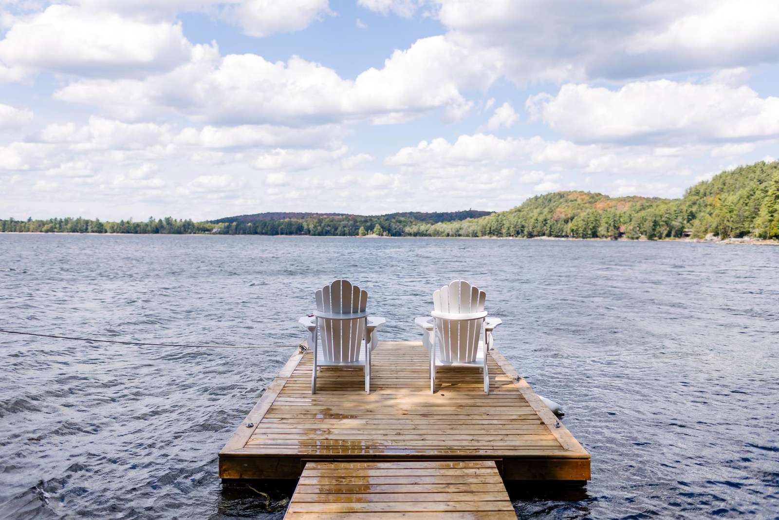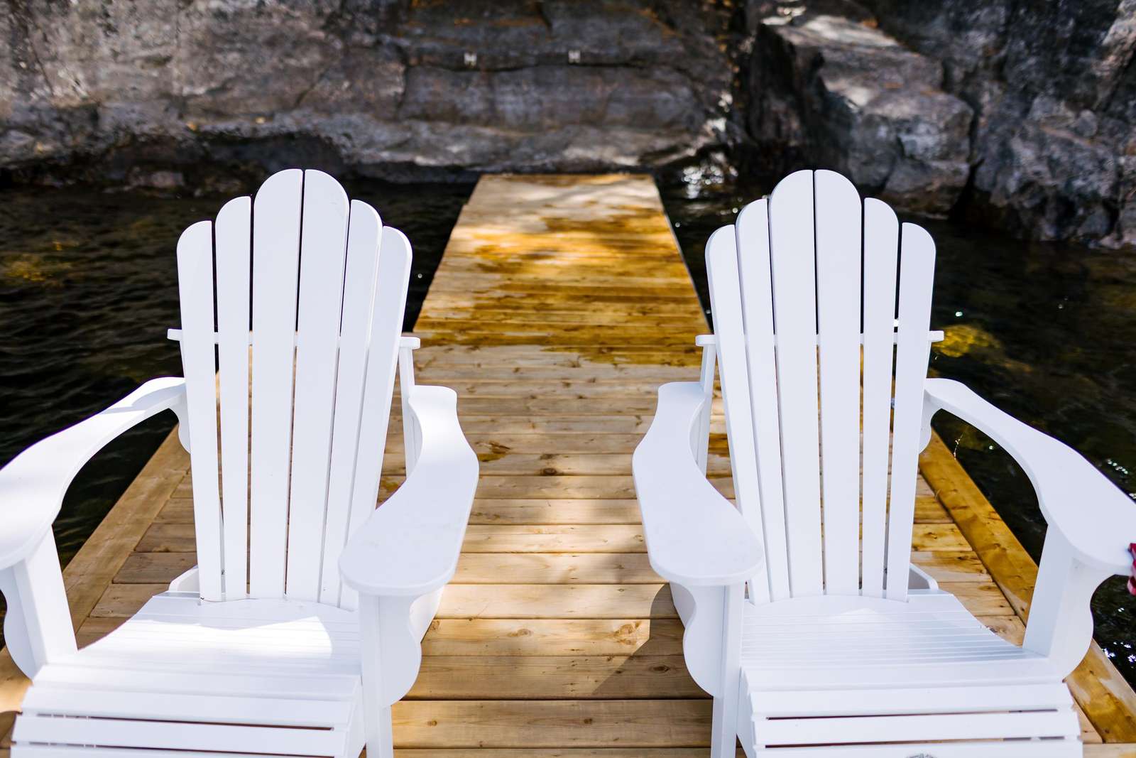 Large dock with two Adirondack chairs