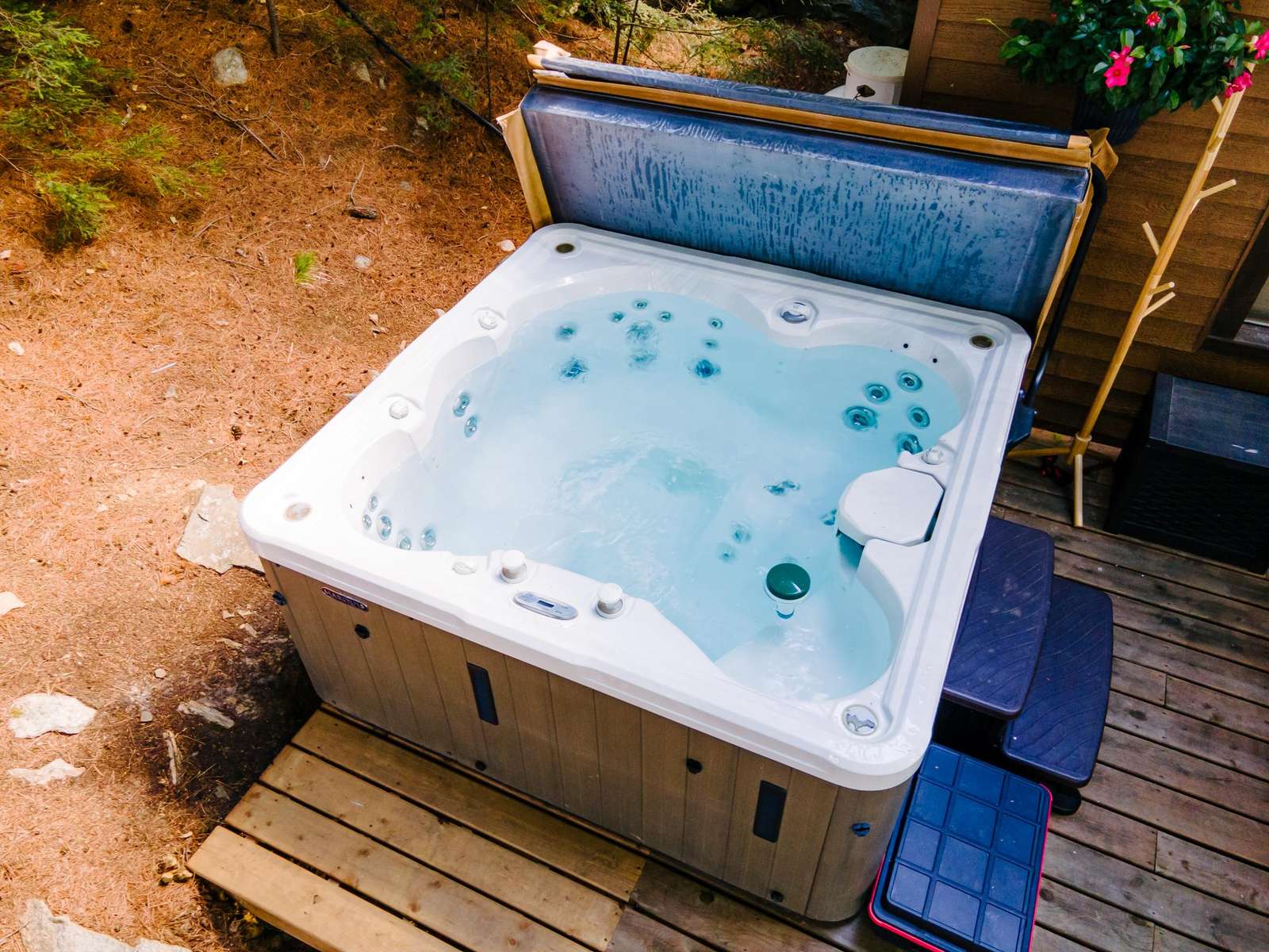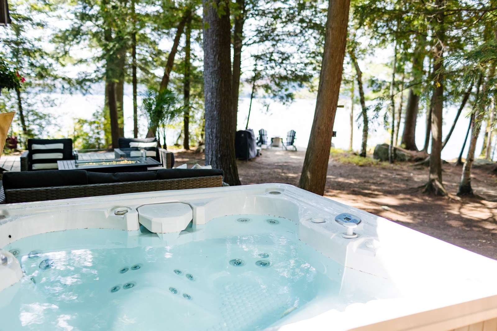 Tranquil lakeside hot tub retreat surrounded by towering trees