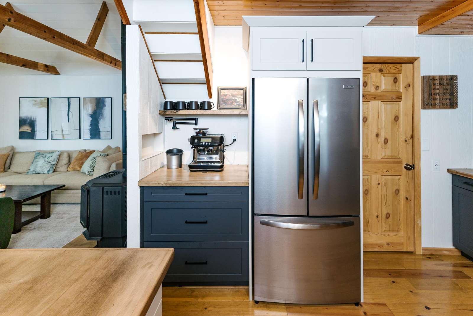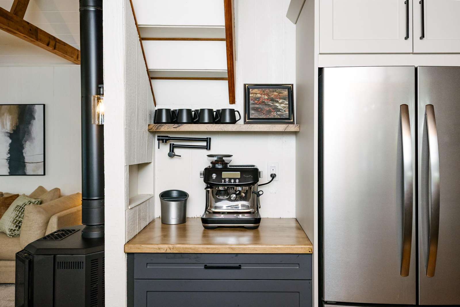 Modern kitchen with stainless steel appliances feauturing coffee bar