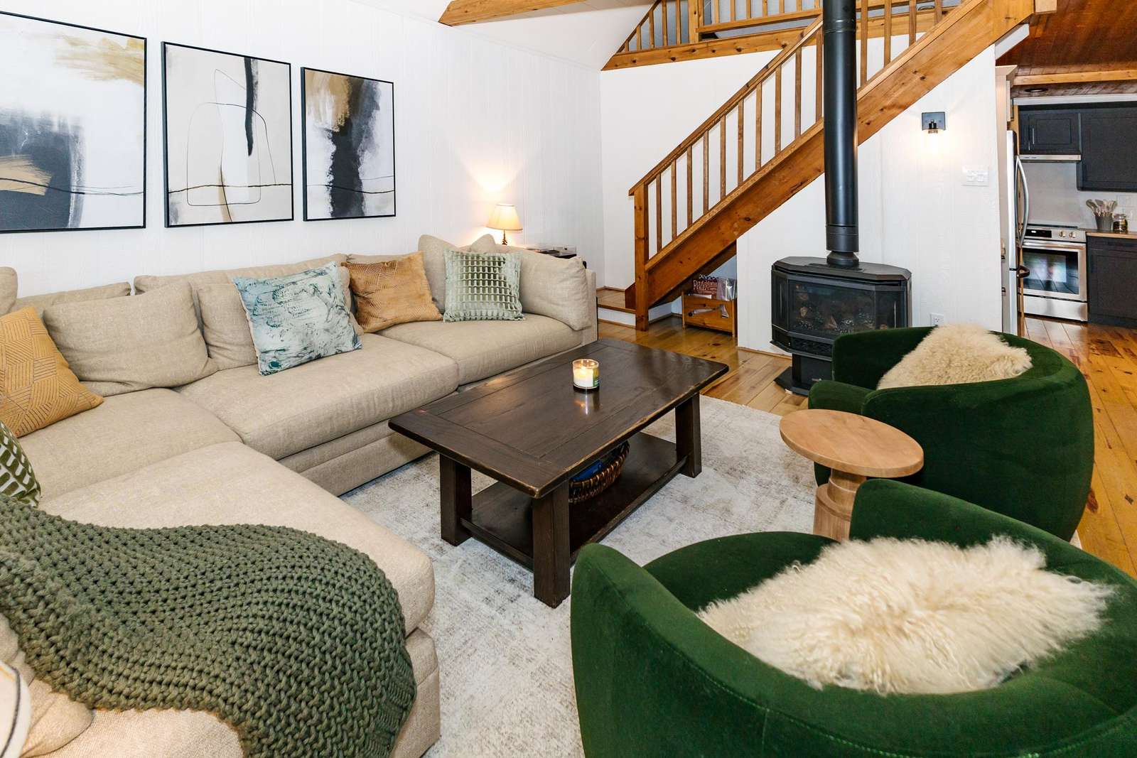 Sunlit living room with vaulted ceilings and cozy fireplace