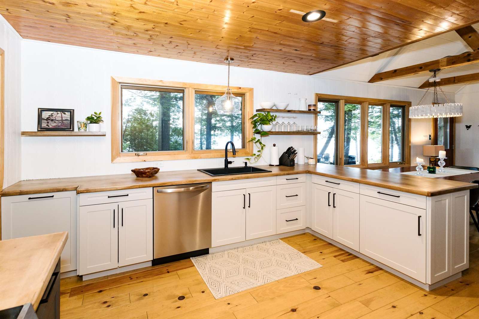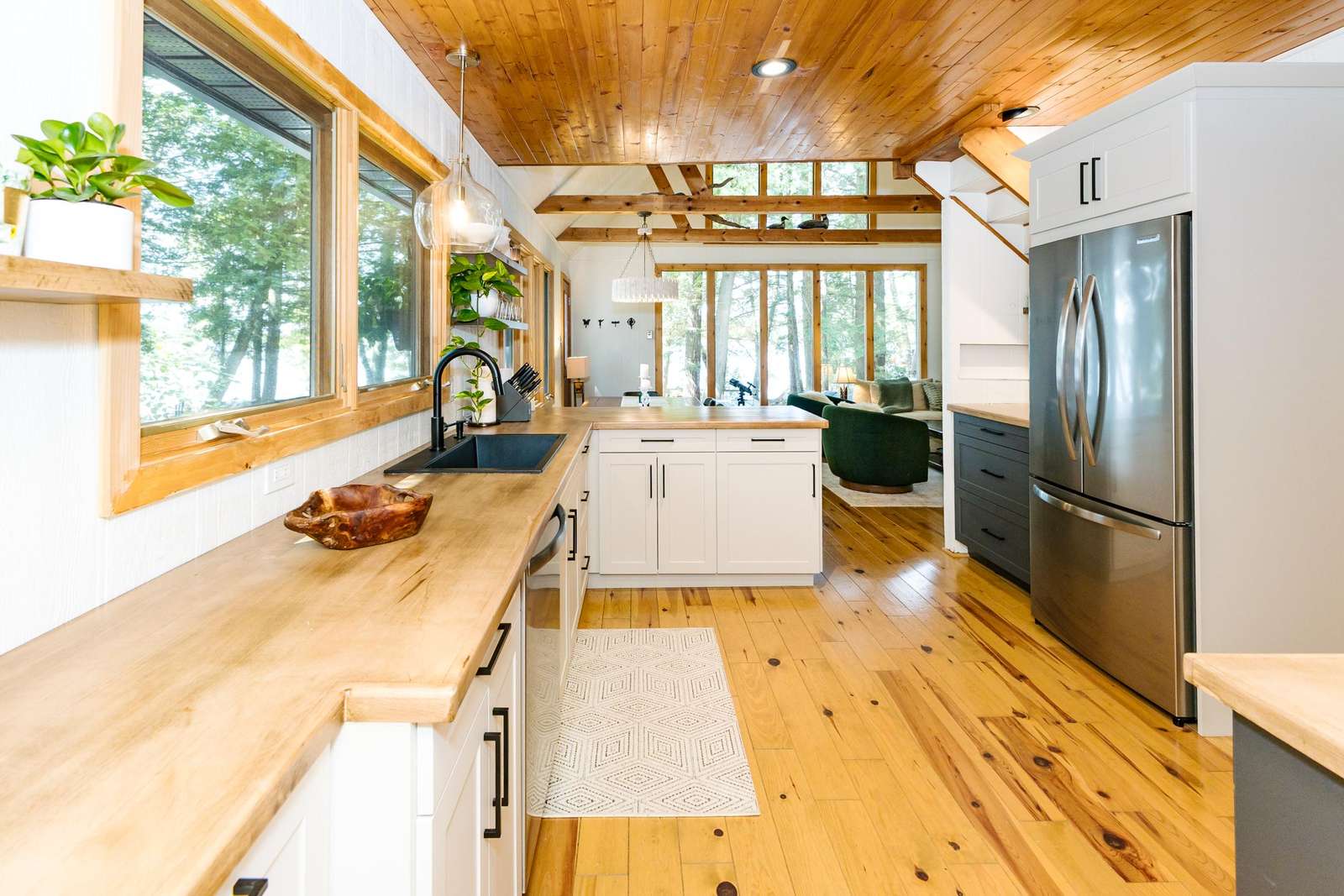 Sunlit kitchen with spacious wooden countertops and modern appliances