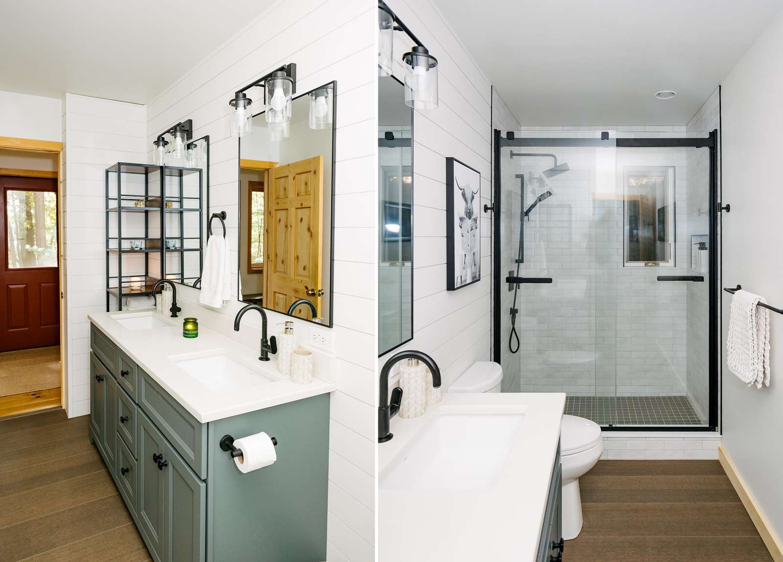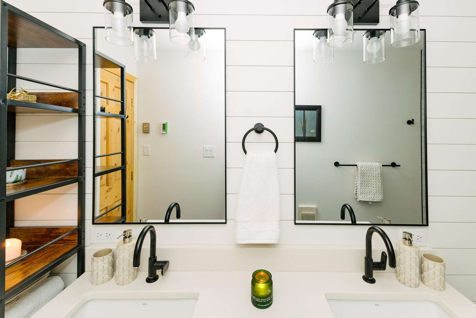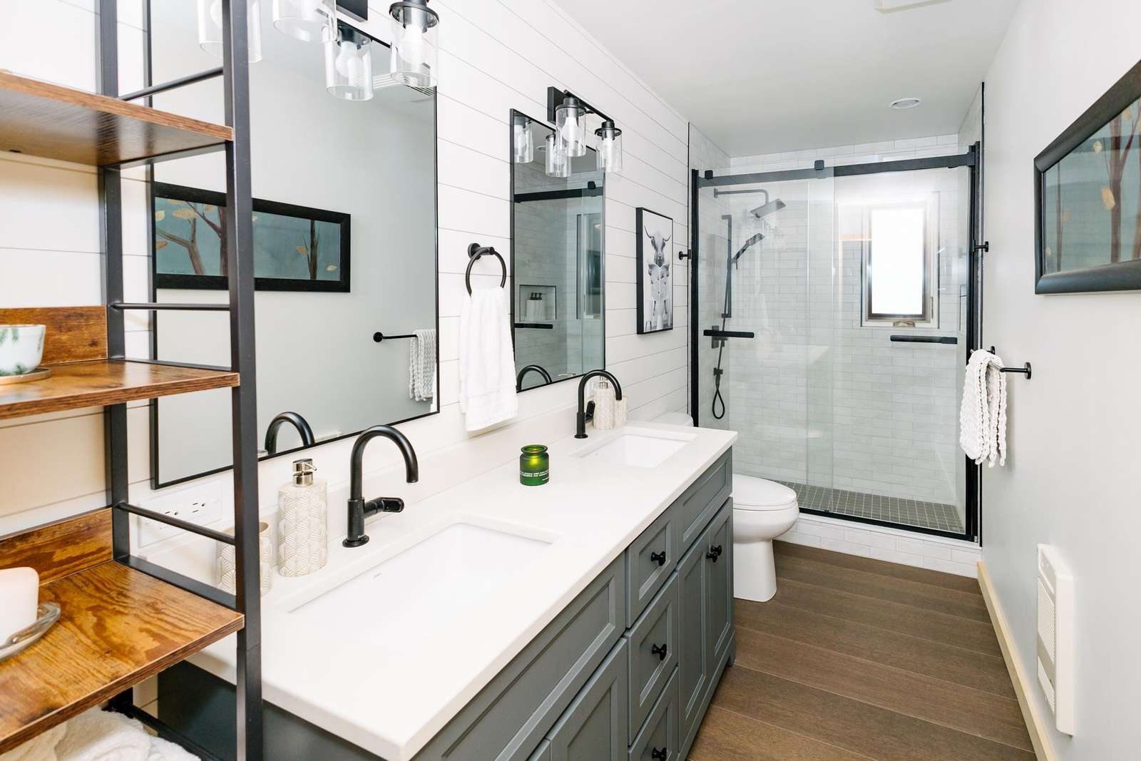 Modern bathroom retreat with spacious walk-in shower and double vanity