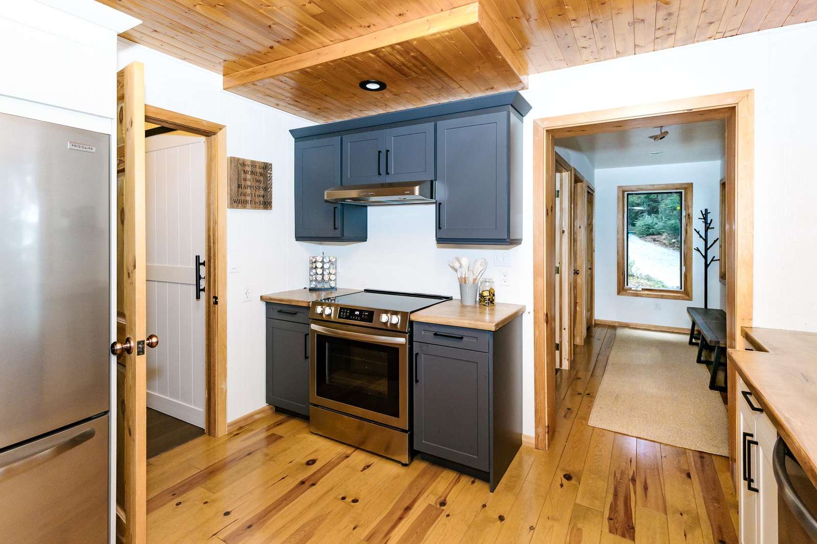 Step through to the spacious wraparound deck, perfect for alfresco dining, morning coffee, or simply soaking in the tranquility. Throughout, warm tongue-and-groove wood floors and ceilings add timeless rustic charm. The main floor also offers a welcoming entry hall, a bright guest bedroom with forest views, the convenience of main floor laundry, and a modern bathroom with double vanity and stand-up shower.