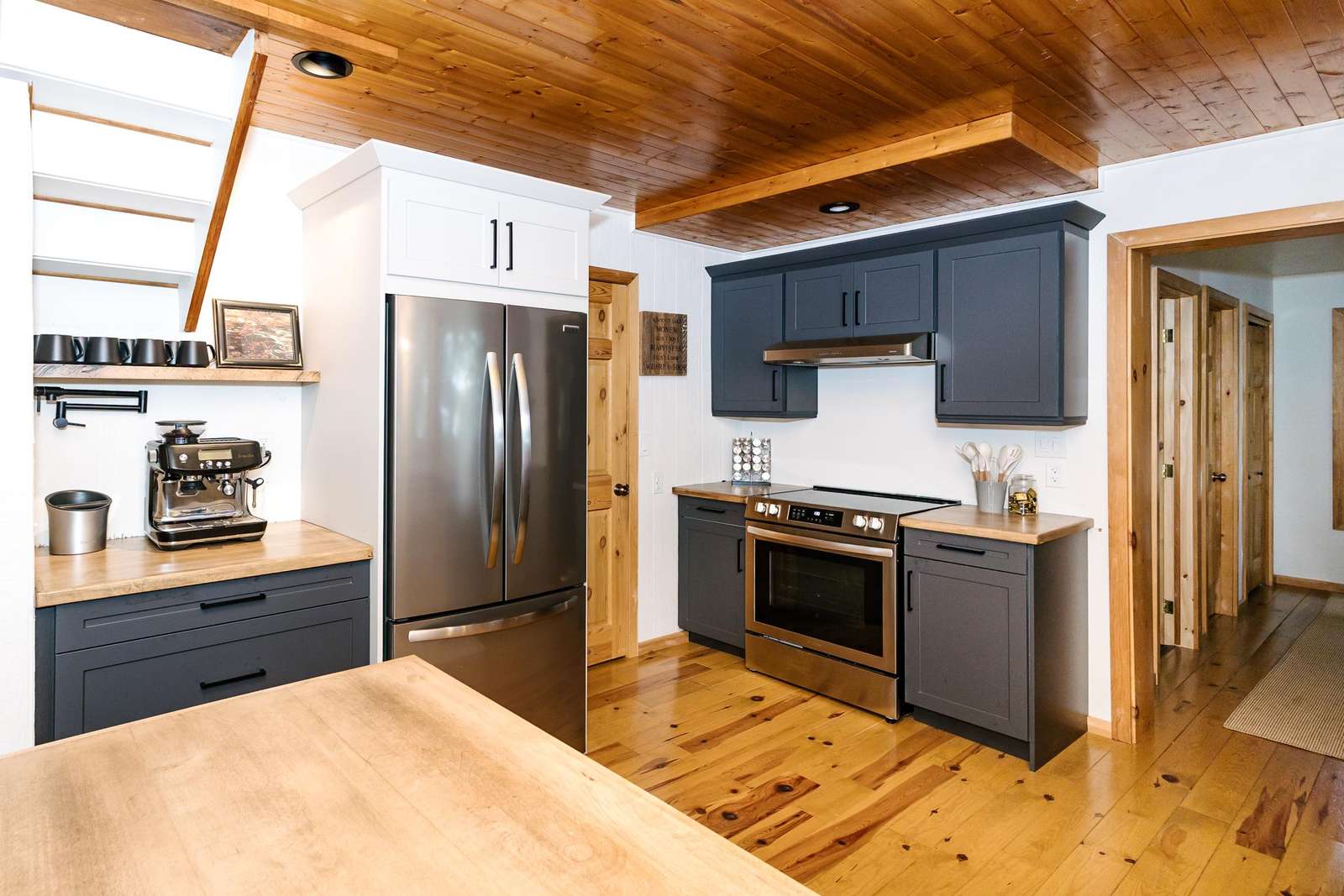 Inside, a thoughtfully updated main floor features an open-concept kitchen with walk-in pantry/storage that flows seamlessly into the dining area and Great Room. The centerpiece of the home, the Great Room, boasts soaring beamed ceilings, a cozy propane stove for cool evenings, and a dramatic window wall that brings the outdoors in.